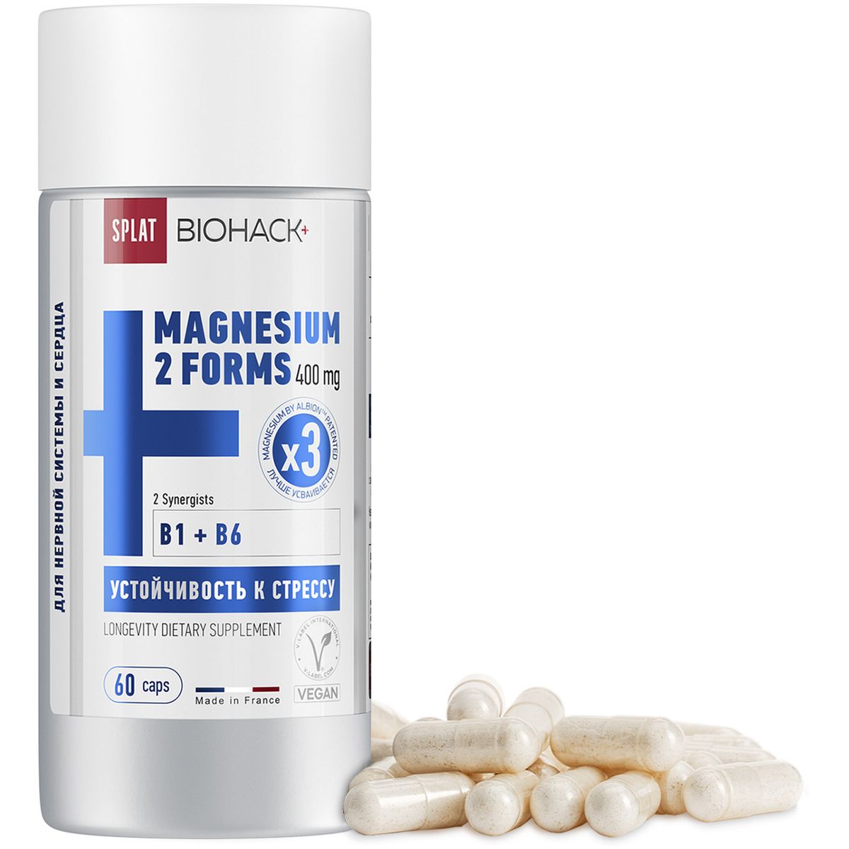 SPLAT BIOHACK+ MAGNESIUM 400 мг элементарного магния в 2 органических активных формах: хелатный магния бисглицинат Albion™ и магния цитрат + синергисты: витамины B1, B6 для усиления эффектов магния.