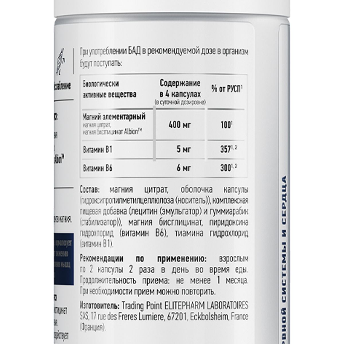 Магния цитрат, оболочка капсулы (гидроксипропилметилцеллюлоза (носитель)), комплексная пищевая добавка (лецитин (эмульгатор) и гуммиарабик (стабилизатор)), магния бисглицинат, пиридоксина гидрохлорид (витамин B6), тиамина гидрохлорид (витамин B1).