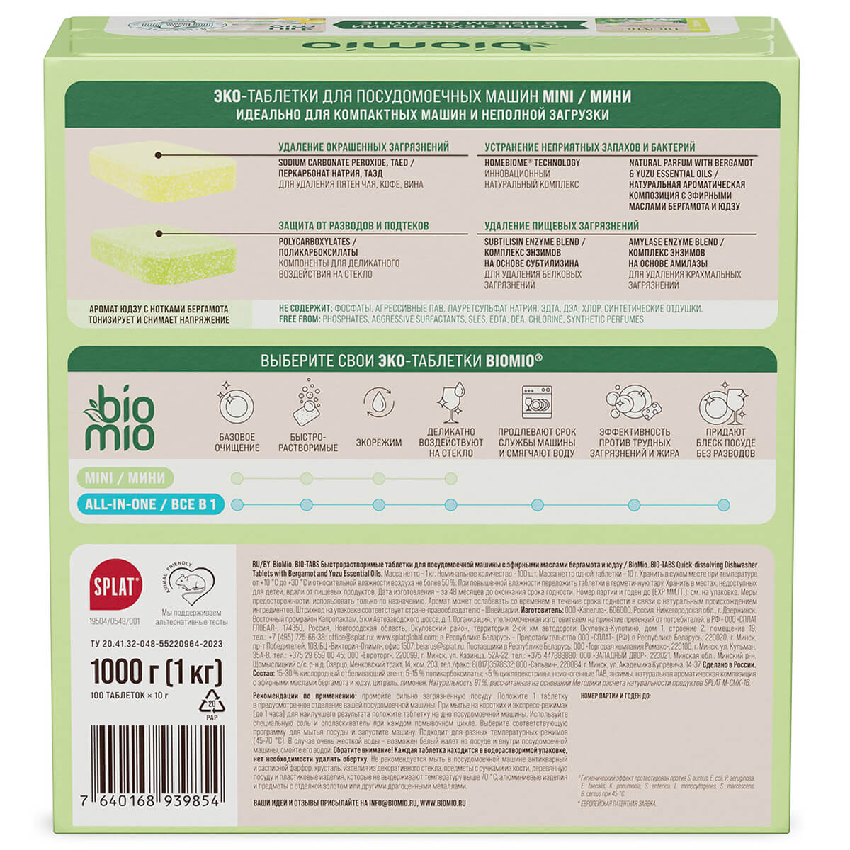 Мини эко таблетки BioMio® BIO-TABS для посудомоечной машины, бергамот и юдзу, 10г / 100 шт
