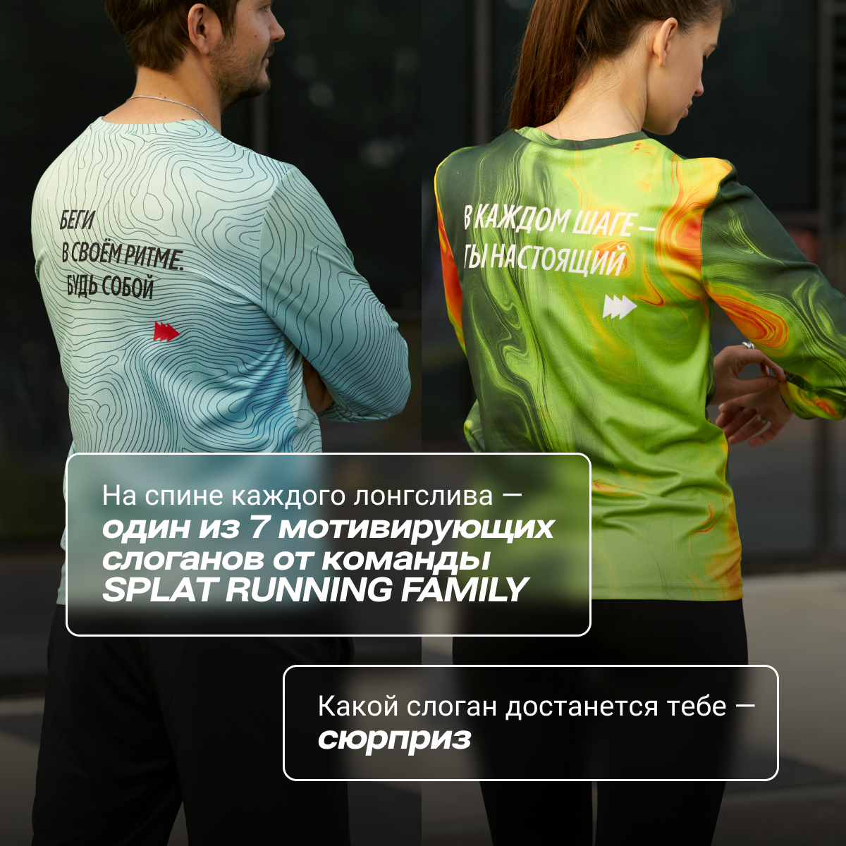 На спине каждого лонгслива — особый мотивирующий слоган, созданный нашей командой бегового клуба SPLAT RUNNING FAMILY. Эти фразы — как слова поддержки от друга на дистанции: чтобы подбодрить, вселить силы и напомнить, что ты не один.