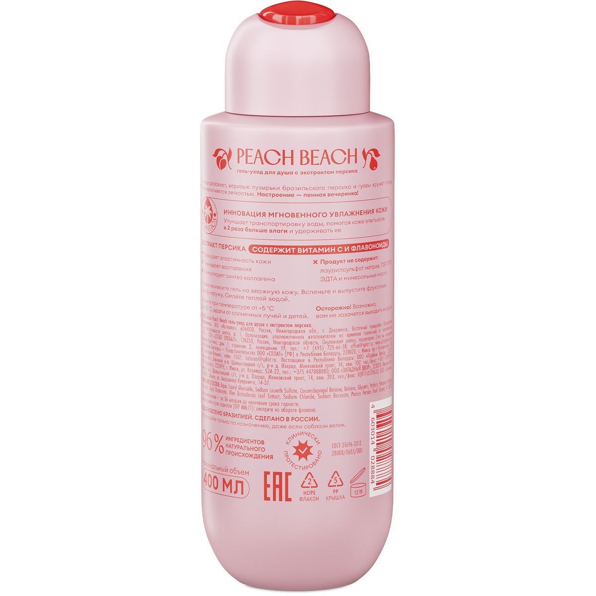 Солнце розовеет, игривые пузырьки бразильского персика и гуавы кружат голову. Тело наполняется легкостью. Настроение — пенная вечеринка! Инновационная технология мгновенного увлажнения кожи HYDRATICA. Улучшает транспортировку воды, помогая коже впитывать в 2 раза больше влаги и удерживать ее. Экстракт персика содержит витамин C и флавоноиды: повышает эластичность кожи, уменьшает воспаления, стимулирует синтез коллагена, снижает трансэпидермальную потерю влаги на 21%, по результатам клинических исследований. Женский гель для тела не оставляет чувства стянутости и шелушения. В составе нет SLES, минерального масла, PEG/PPG, ЭДТА, парабенов.