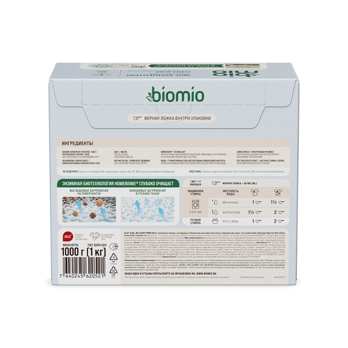 Экологичный концентрированный порошок BIOMIO® для стирки белого белья с кислородным отбеливателем благодаря биотехнологиям HOMEBIOME® удаляет невидимые загрязнения, сохраняет длительную белизну и форму тканей. Гипоаллергенная формула. Экономичный расход - достаточно одной ложки на стирку в мягкой воде.