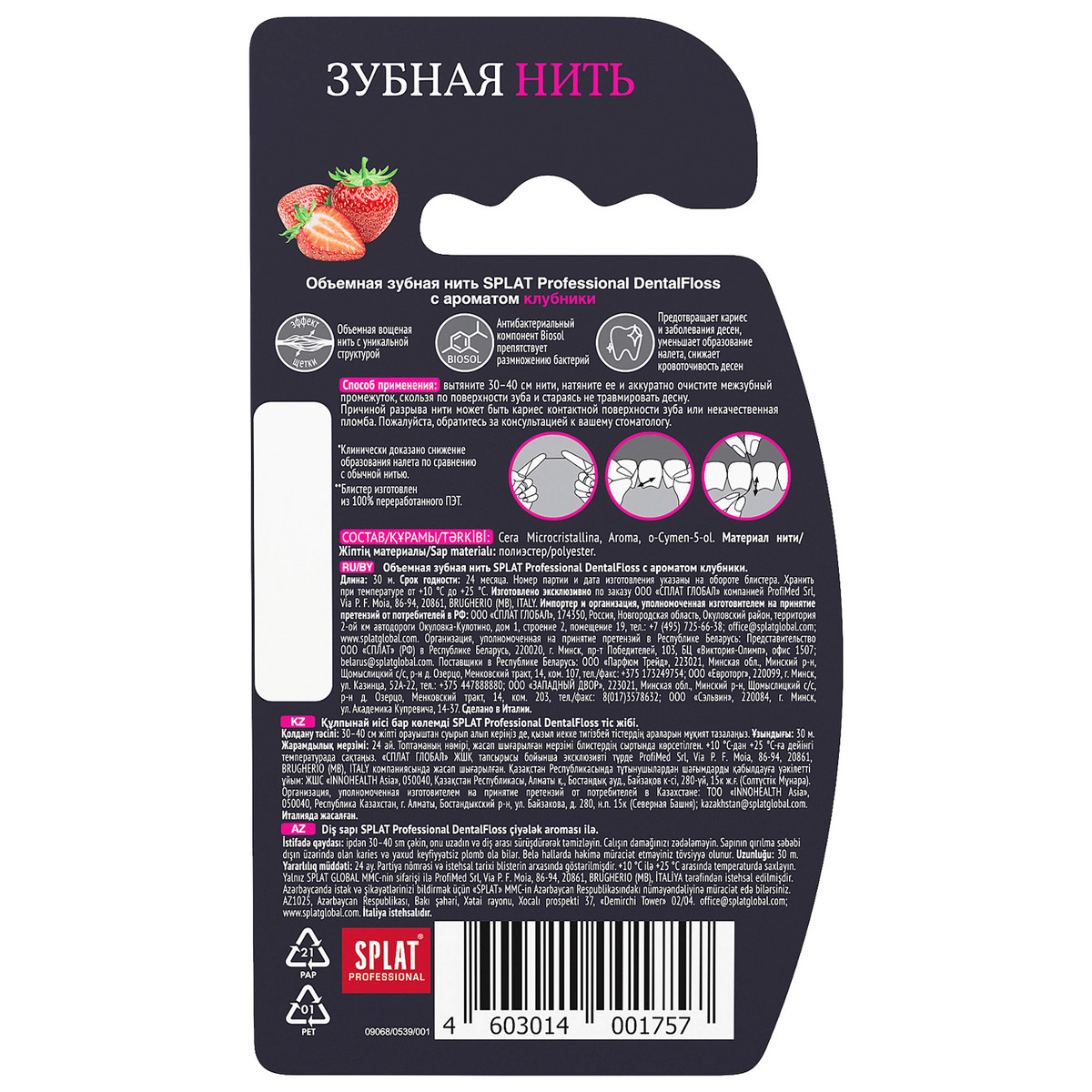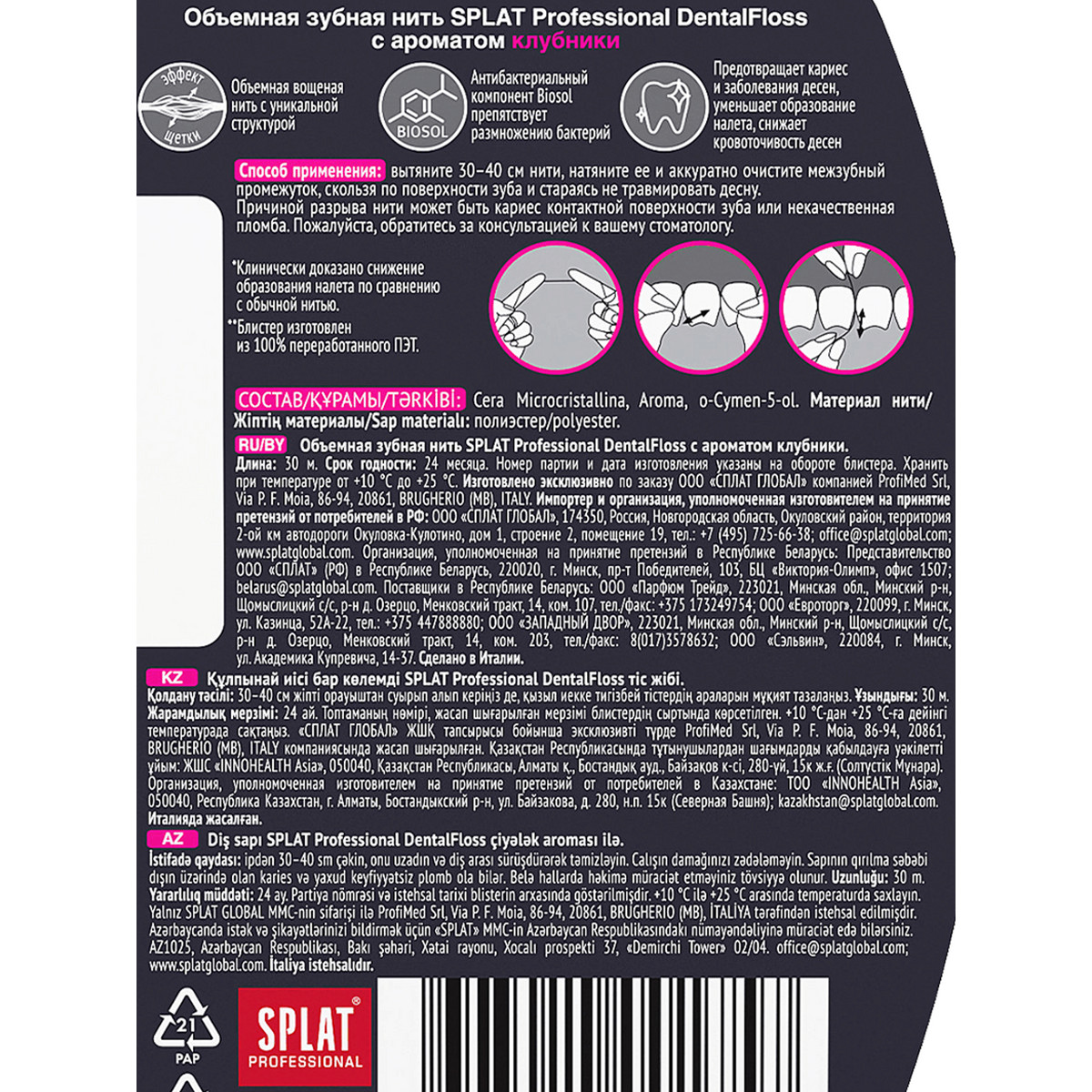 Объемная зубная нить благодаря уникальной структуре обеспечивает тщательное очищение боковых поверхностей зубов. В процессе использования нити ее волокна распушаются, что гарантирует более эффективную очистку межзубных промежутков. Компонент Biosol в составе нити оказывает противокариесное действие.