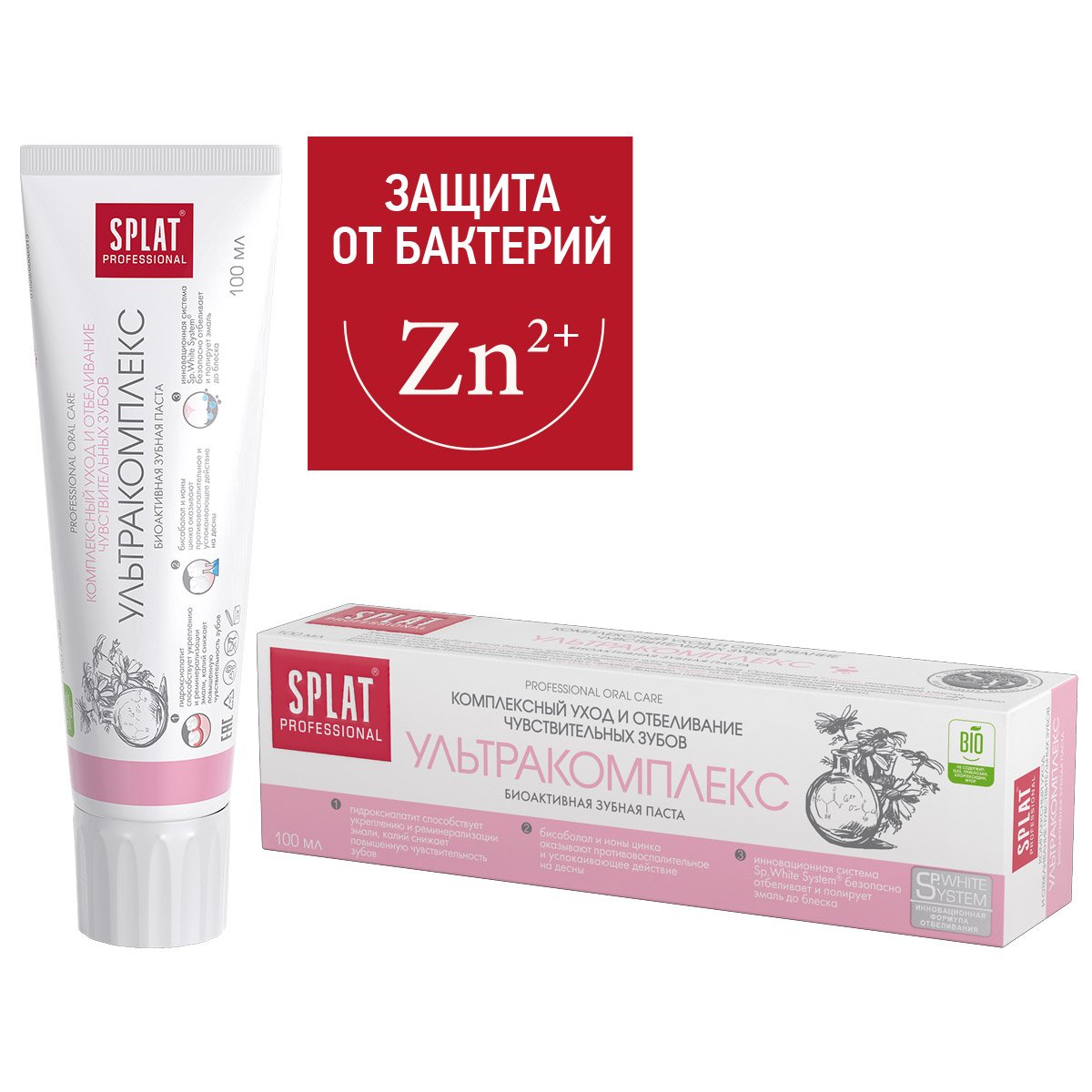 Биоактивная зубная паста УЛЬТРАКОМПЛЕКС предназначена для комплексного ухода за особо чувствительными зубами. В состав входят биоактивный Кальцис, полученный из яичной скорлупы, и гидроксиапатит – строительное вещество твердых тканей зуба. Ионы цинка оказывают антибактериальное действие на десны.