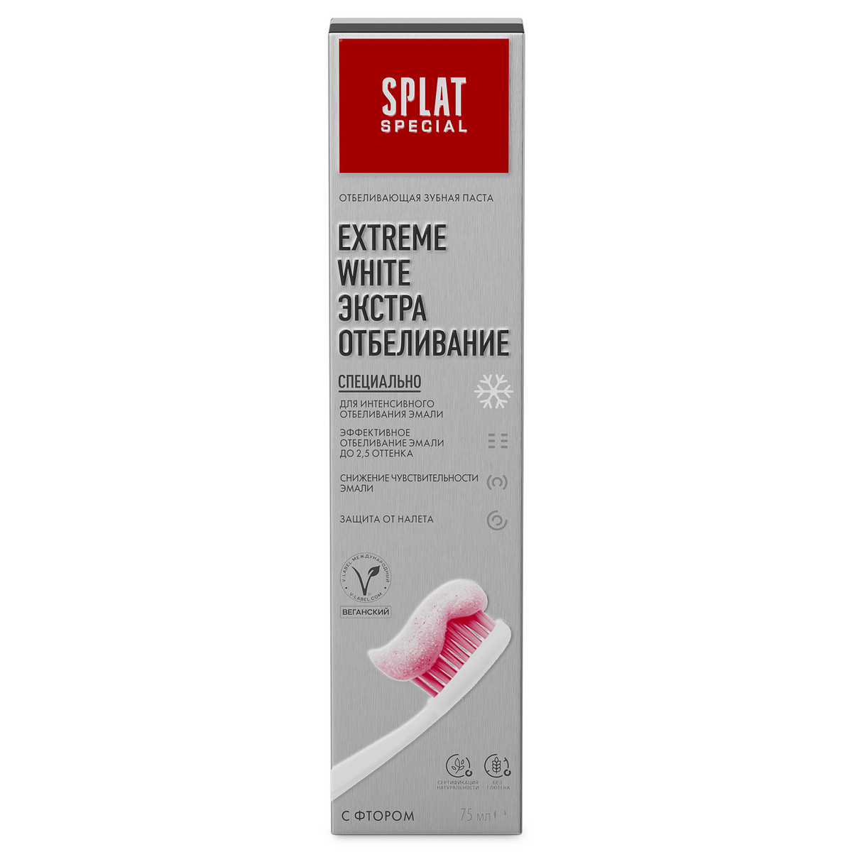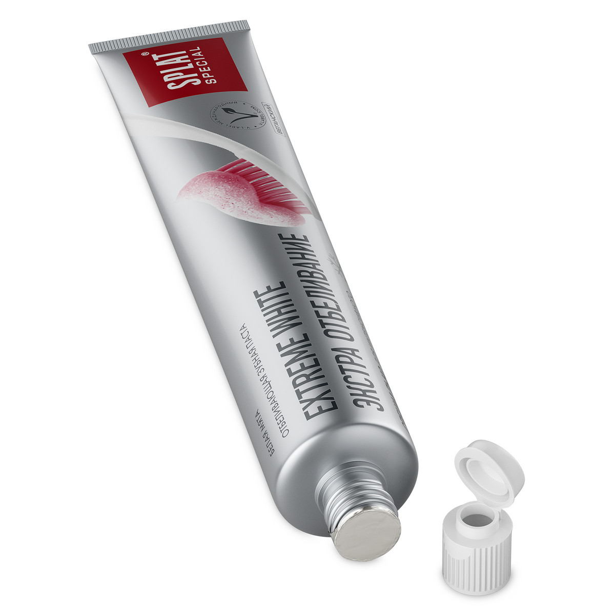 Эффективное профессиональное отбеливание зубной эмали теперь возможно и дома – в этом поможет инновационная профессиональная отбеливающая зубная паста SPLAT® EXTREME WHITE, которая содержит микрогранулы с пероксидом карбамида и уникальный отбеливающий комплекс Sp.White system®.