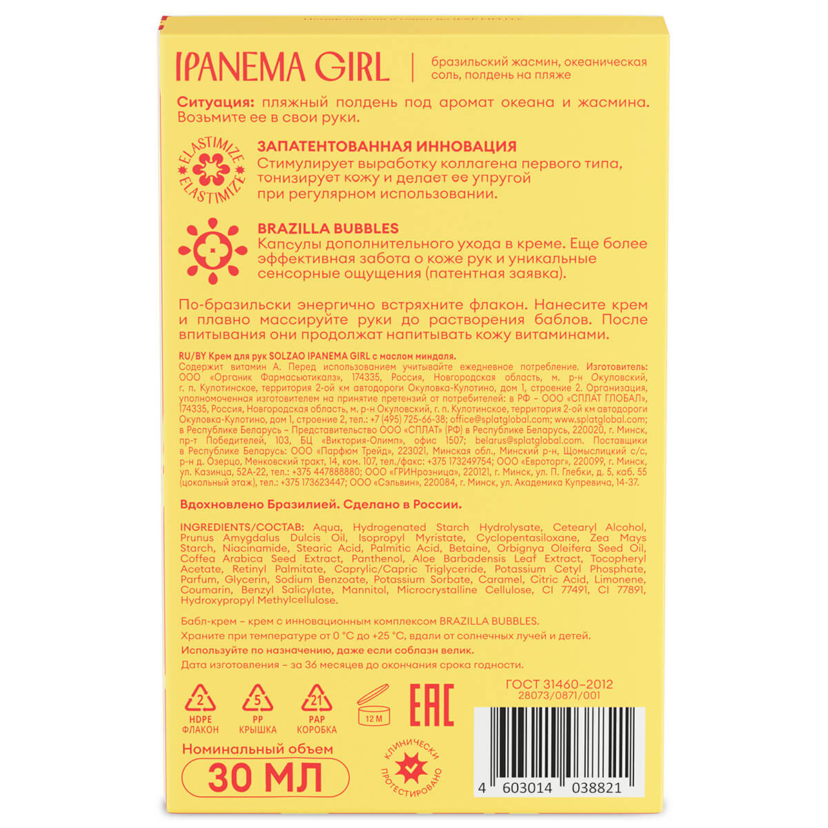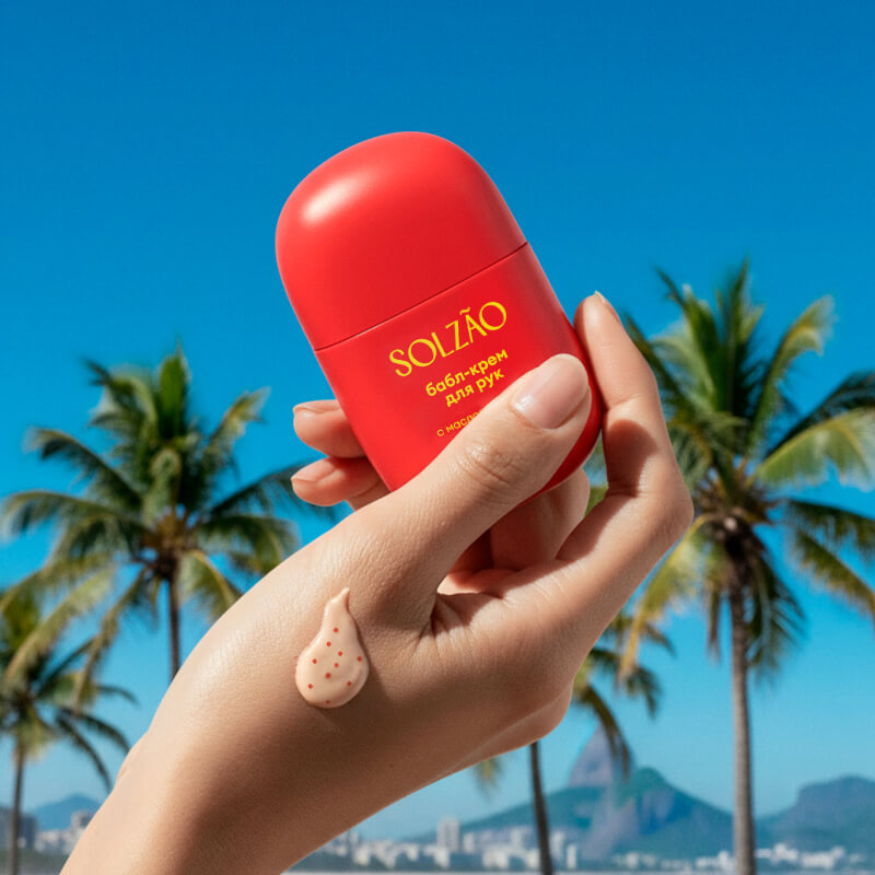 По-бразильски энергично встряхните флакон. Нанесите крем и плавно массируйте руки до растворения баблов. После впитывания они продолжат напитывать кожу витаминами.
