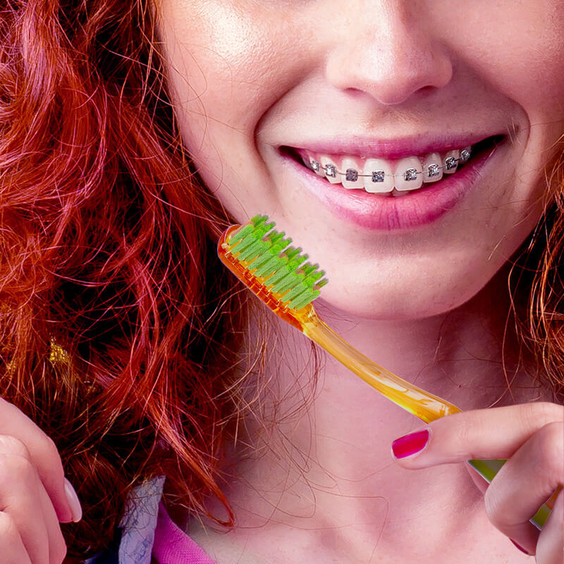 Короткие и более жёсткие щетинки в центре — для вычищения пространства между брекетами и эмалью зуба. Высокие спиральные щетинки по краям — для бережной заботы о дёснах и эффективного очищения эмали