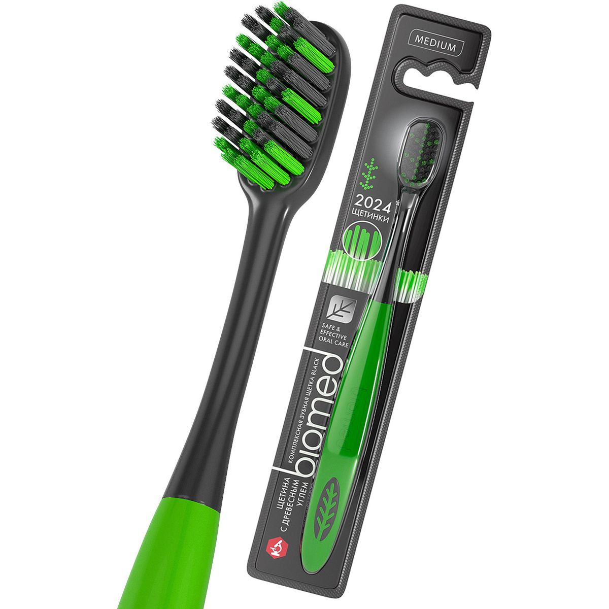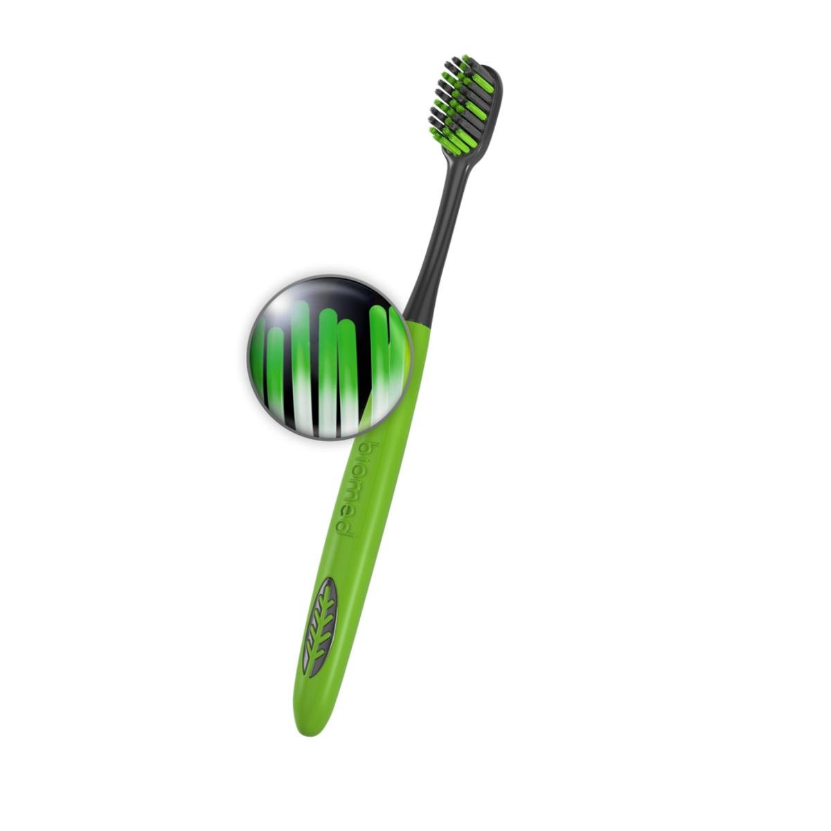 Зубная щетка средней жесткости с угольным напылением щетины эффективно и бережно удаляет зубной налет, при этом не травмируя десны. 2024 щетинки очищают зубы за 30 секунд - доказано клинически. Зубная щетка сделана из пластика высокого качества, безопасна для детей и природы.