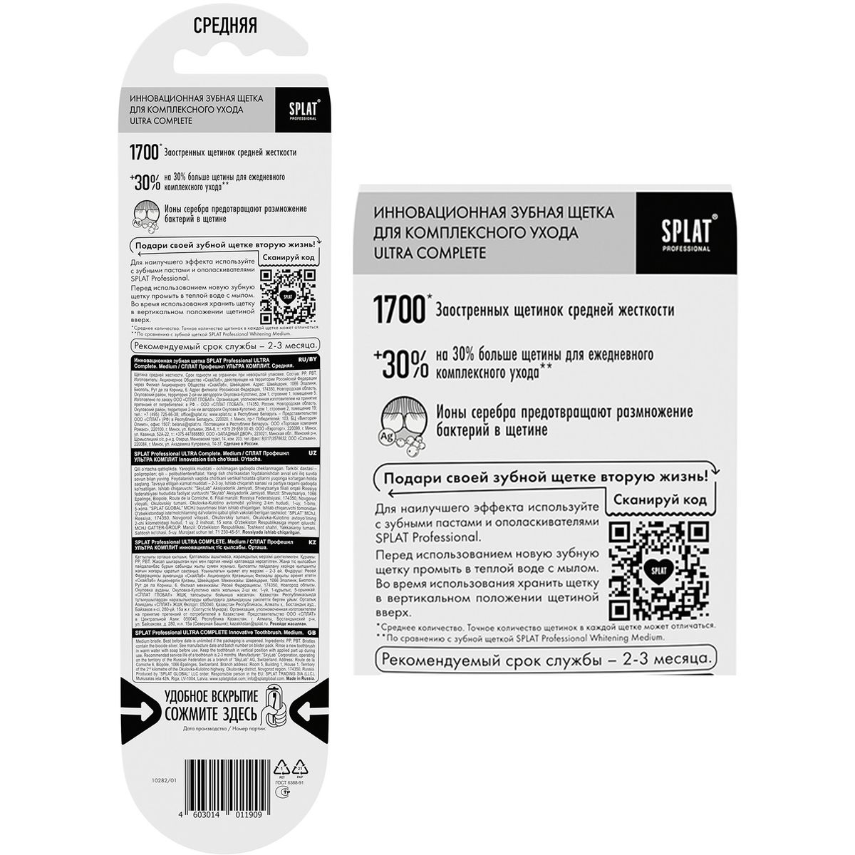 Продукция SPLAT соответствует глобальному мировому тренду – стремлению к безопасности потребления. Поэтому новая зубная щетка SPLAT ULTRA COMPLETE не содержит ПВХ (один из самых ядовитых пластиков), латекс (сильный аллерген) и бисфенол А (может вызвать нарушения эндокринной системы).